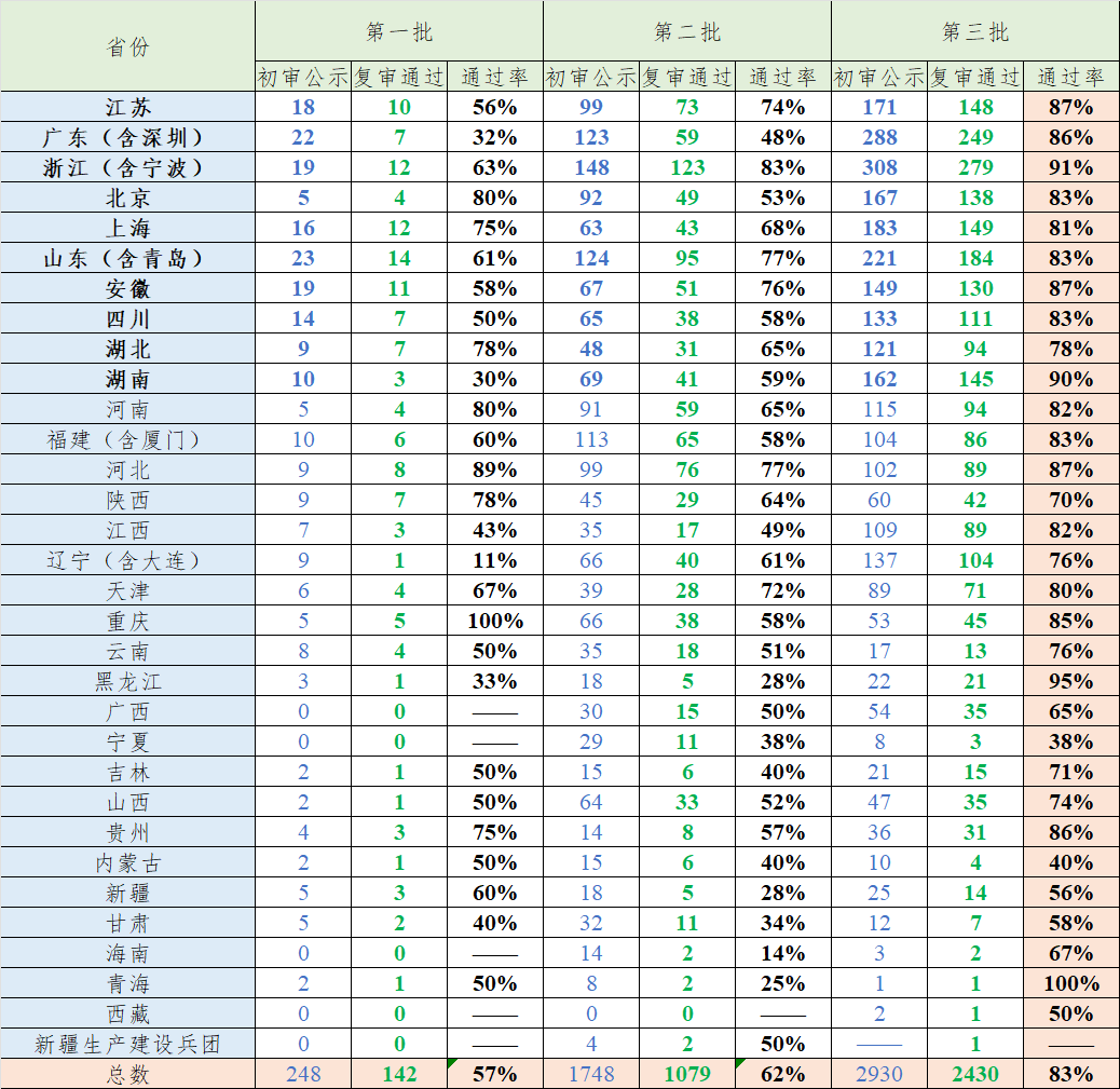 圖3.各省市前三批“小巨人”復(fù)審?fù)ㄟ^率一覽