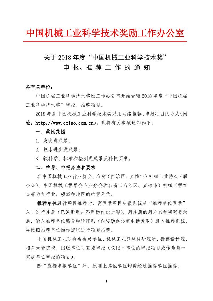 附件:關(guān)于2018年度“中國機(jī)械工業(yè)科學(xué)技術(shù)獎(jiǎng)”申報(bào)、推薦工作的通知
