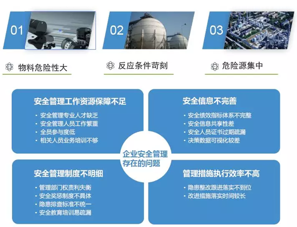 隨著社會(huì)對(duì)企業(yè)安全生產(chǎn)和環(huán)境保護(hù)的重視程度日益提高,安全、環(huán)保已成為化工企業(yè)的核心競(jìng)爭(zhēng)力。對(duì)此,從國(guó)家層面到地方政府制定了一系列安全、環(huán)保管理的法律法規(guī),企業(yè)也相應(yīng)制定了一系列管理制度,以確保安全、環(huán)保管理的合法合規(guī)。然而,仍然存在大量違章指揮、違章操作、違反勞動(dòng)紀(jì)律的現(xiàn)象發(fā)生,從而導(dǎo)致嚴(yán)重事故的發(fā)生。在安全、環(huán)保管理過(guò)程中亟需一個(gè)標(biāo)準(zhǔn)化的解決方案推動(dòng)制度的執(zhí)行及效果跟蹤,確保安全、環(huán)保管理措施的落地,為企業(yè)“零事故、零傷亡”目標(biāo)的實(shí)現(xiàn)保駕護(hù)航。