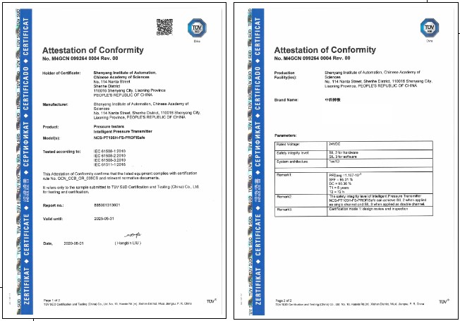 近日,中國科學(xué)院沈陽自動化研究所獲得了國際認證機構(gòu)TüV (南德意志大中華集團)頒發(fā)的總線型智能壓力變送器SIL2/3功能安全認證證書,這是我國首張總線型壓力變送器安全認證證書。此前,沈陽自動化所獲得了該機構(gòu)頒發(fā)的智能溫度變送器SIL2/3功能安全認證證書。
