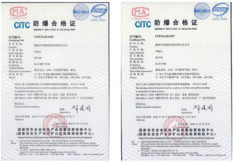 2020年10月28日,湖南聲儀測控所研發(fā)的HY128系列多功能聲級計,含HY128、HY128A、HY128B、HY128C四種型號產(chǎn)品,順利通過國家有色冶金機電產(chǎn)品質(zhì)量監(jiān)督檢測中心防爆認證,同時獲得本安防爆、礦用本安防爆合格證。這意味著該系列產(chǎn)品能進一步適應不同場所和不同環(huán)境下的廣泛應用,并且有更多型號和不同功能供客戶根據(jù)需要提供貼切選擇。