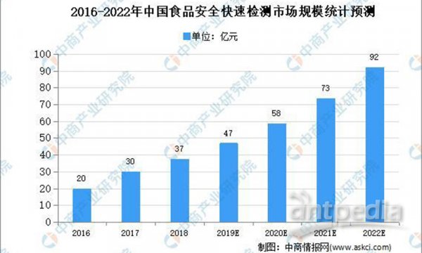 中國食品安全快檢產業(yè)化僅僅二十年,在我國分析測試領域,雖是“小荷才露尖尖角”,但發(fā)展速度非常迅猛。據中商產業(yè)研究院報告顯示,我國食品快速檢測的投入規(guī)模約占食品檢測總投入規(guī)模的30%,數據顯示,2016年、2017年國內食品快速檢測市場規(guī)模分別為19.68億元、29.77億元,預計2017年至2022年的年度復合增長率為25.24%,到2022年國內食品安全快速檢測市場規(guī)模(包括試劑和快檢儀器)為91.75億元。快檢行業(yè)的迅猛發(fā)展來源于幾大方面:首先,新《食品安全法》肯定了快檢在市場監(jiān)管中的地位。其次,食品安全的分段管理、現場檢測極大拓展了市場對快檢的需求。第三,隨著國家監(jiān)管力度的加大,更多的污染物成為監(jiān)管目標,更多食物的安全引起社會的關注。第四,科技部自“十二五”起,對快檢技術給予了持續(xù)的支撐。因此快檢技術和產業(yè)在中國是蓬勃的新生力量。