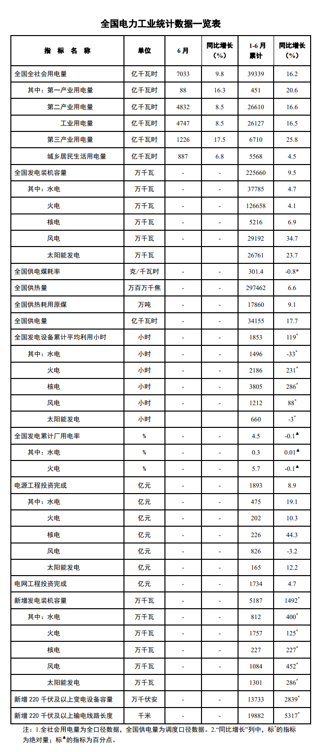 7月16日,國家能源局發布1-6月份全國電力工業統計數據。截至6月底,全國發電裝機容量約為22.6億千瓦,同比增長9.5%。其中,風電裝機容量約為2.9億千瓦,同比增長34.7%。太陽能發電裝機容量約為2.7億千瓦,同比增長23.7%。