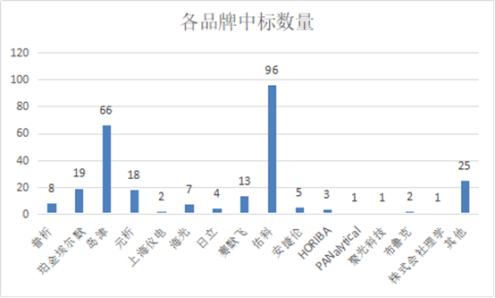 就中標金額來說,島津可統計的中標金額為788.59萬元,位居各品牌首位。賽默飛和HORIBA分別以622.351萬元和456.9萬元位居第二第三,珀金埃爾默以454.55萬元居第四,而佑科雖然數量上穩居第一中標總價格僅為64.608萬元。