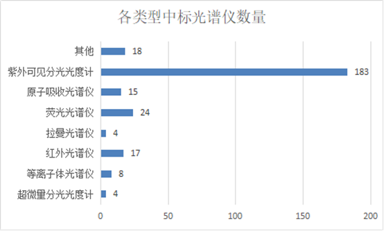 就中標金額來說,熒光光譜儀的中標總金額達956.974萬元,約占中標總金額的19%。數量最多的紫外可見分光光度計,中標總金額為946.76萬元,與熒光光譜儀金額差別不大,也約占總金額的19%。紅外光譜儀的成交總金額為708.3505萬元,位居第三。