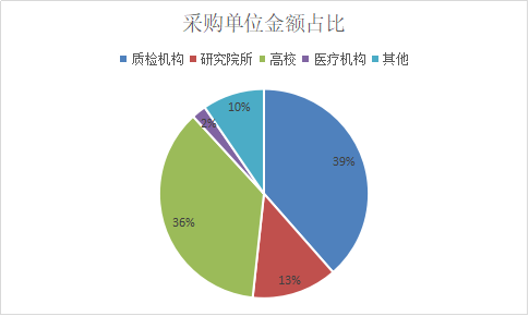 從色譜采購單位金額占比來看,7月中標(biāo)儀器共40套,可統(tǒng)計中標(biāo)金額的共33套,總計2403.74萬元。質(zhì)檢機構(gòu)雖與高校數(shù)量持平,但其采購金額高達929.26萬元,位列第一。高校采購金額為876.71萬元,位列第二,與質(zhì)檢機構(gòu)相差52.55萬元,占比金額相差3%。單臺中最高金額也來自科研院所。菏澤學(xué)院以345.6萬元超高效液相色譜串聯(lián)四極桿,暫無品牌和型號。除去環(huán)境部門沒有具體采購金額,未統(tǒng)計在表格中,醫(yī)療機構(gòu)采購的色譜儀器中標(biāo)金額最小,可統(tǒng)計的中標(biāo)金額只有1套,中標(biāo)金額是53.9萬元。