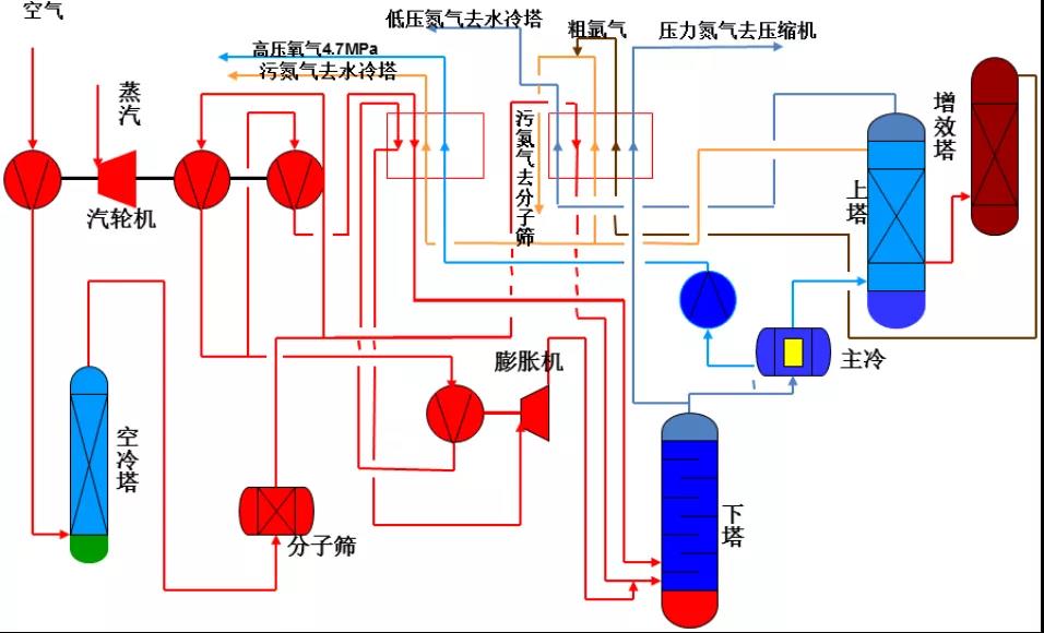 多次的重復(fù)上述過程,氣相的氮濃度就不斷增加,液相的氧濃度也能不斷的增加。這樣經(jīng)過多次的蒸發(fā)與冷凝就能完成整個精餾過程,從而將空氣中的氧和氮分離開來。空氣在下塔被初步精餾為氣氮、污液氮和富氧液空,以節(jié)流閥減壓降溫后送至上塔作為上塔的回流液,進(jìn)一步實現(xiàn)精餾,最終在上塔頂部得到純氮氣,下部得到合格的液氧產(chǎn)品。