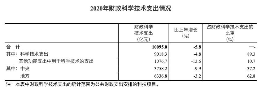 2020年國家財(cái)政科技支出出現(xiàn)下降,為10095.0億元,比上年減少622.4億元,下降5.8%。其中,中央財(cái)政科技支出下降9.9%,地方財(cái)政科技支出下降3.2%。