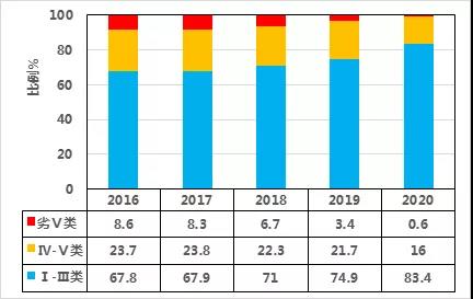 十三五期間,全國地表水監(jiān)測的水質(zhì)斷面(點(diǎn)位)中,Ⅰ-Ⅲ類水水質(zhì)斷面逐步上升,劣Ⅴ類水逐步下降,如下圖,可以得到,十三五末期的Ⅰ-Ⅲ類水占比已達(dá)83.4。