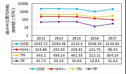 根據(jù)2013-2017年《中國統(tǒng)計(jì)年鑒》,我國廢水排放總量保持在700億噸,其中廢水中COD、氨氮(NH4+)、總氮(TN)、TP排放量如下圖,可見2015年國務(wù)院發(fā)布了《水污染防治行動計(jì)劃》(簡稱“水十條”)后,這幾種污染物排放量得到了削減。