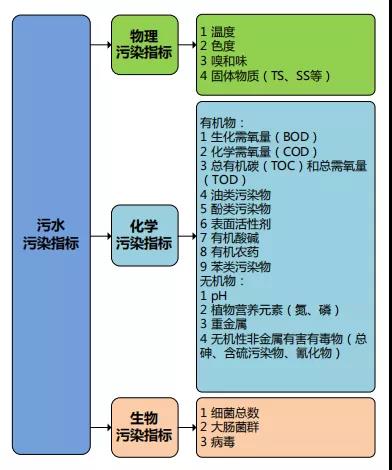 城鎮(zhèn)污水指由城鎮(zhèn)排水系統(tǒng)收集的生活污水、工業(yè)廢水、部分城鎮(zhèn)地表徑流(雨雪水),是一種綜合污水。污水所含的污染指標(biāo)常分為物理、化學(xué)、生物三類,如下圖,其中《城鎮(zhèn)污水處理廠污染物排放標(biāo)準(zhǔn)》(GB18918-2002)對其中項(xiàng)目設(shè)置排放濃度限值。