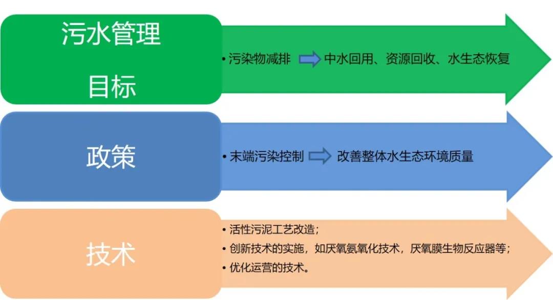近幾十年來,中國污水行業(yè)經(jīng)歷了高速增長,在基礎(chǔ)設(shè)施建設(shè)、技術(shù)創(chuàng)新、人才培養(yǎng)等方面取得了進(jìn)步,為未來的智慧化、低碳化、資源化發(fā)展奠定了堅(jiān)實(shí)的基礎(chǔ)。然而,未來仍然充滿不確定性和挑戰(zhàn)。預(yù)計(jì)隨著人口的持續(xù)增長和城市化進(jìn)程,水資源短缺將更加嚴(yán)重,而污水量將進(jìn)一步增加。這將要求污水管理目標(biāo)、政策和技術(shù)發(fā)生根本性變化,如下