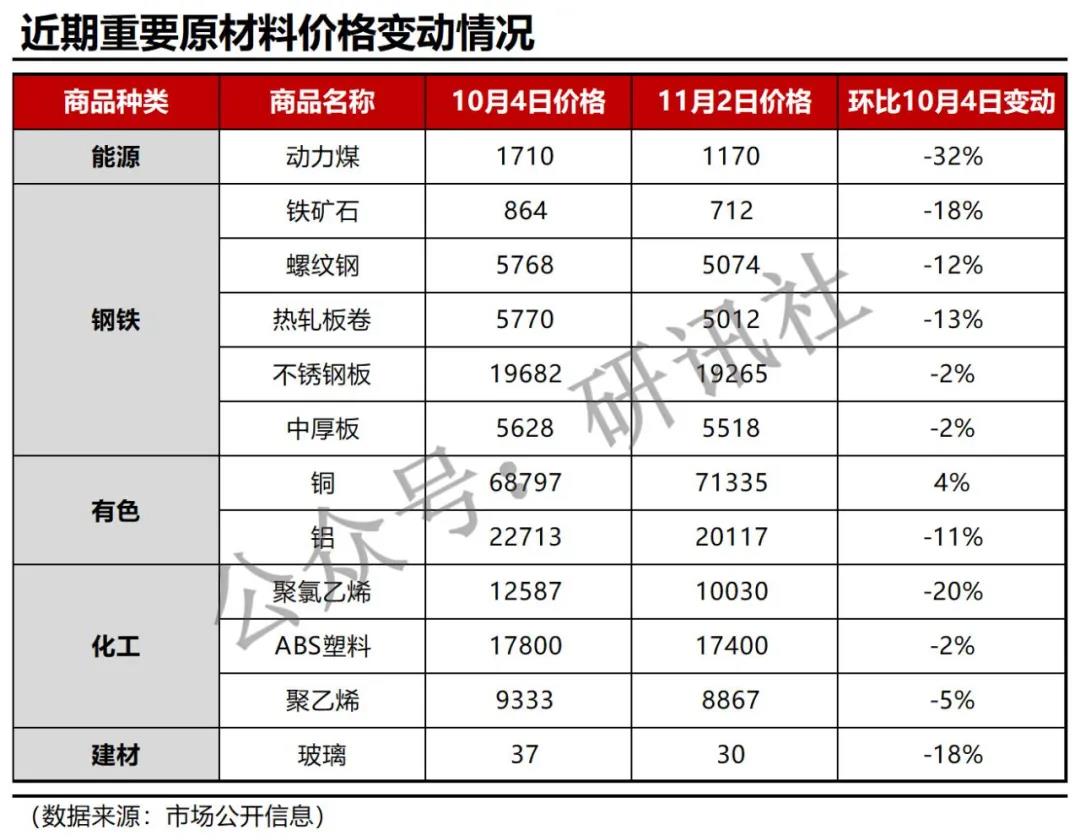 截止11月2日,動(dòng)力煤現(xiàn)貨價(jià)格環(huán)比10月初回落超過(guò)30%,鐵礦石、螺紋鋼、熱卷、鋁等金屬價(jià)格環(huán)比跌幅超過(guò)了10%,聚氯乙烯、ABS塑料、聚乙烯等工業(yè)常用的化工材料價(jià)格呈