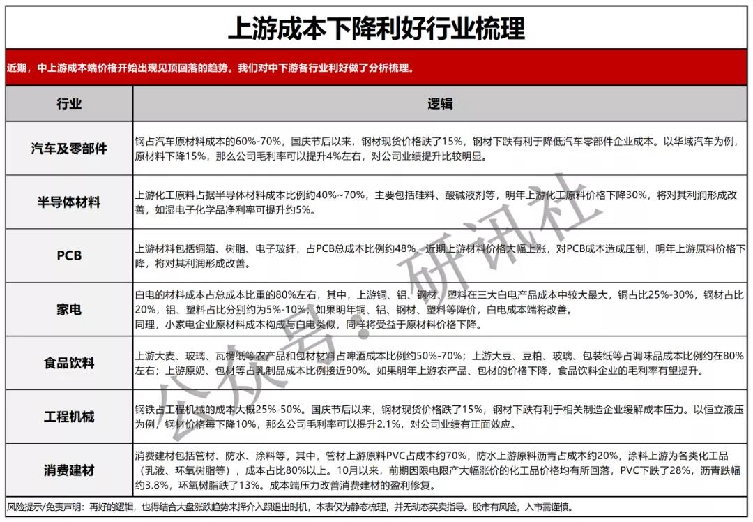 上游成本端價(jià)格回落對(duì)中下游各行業(yè)利好分析:隨著全球供給恢復(fù)、運(yùn)輸效率提升,今年年底到明年年初上游原材料價(jià)格回落是大概率事件,對(duì)應(yīng)的此前受成本端壓制的中下游企業(yè)盈利大概率將修復(fù)。