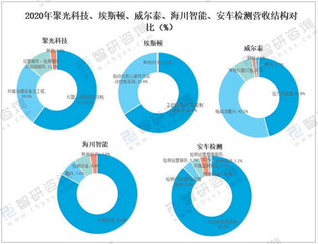 2020年聚光科技、埃斯頓、威爾泰、海川智能、安車檢測營收結構對比(%)