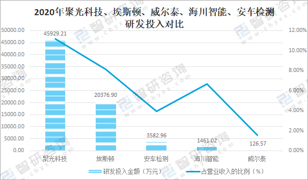 2020年聚光科技、埃斯頓、威爾泰、海川智能、安車檢測研發投入對比