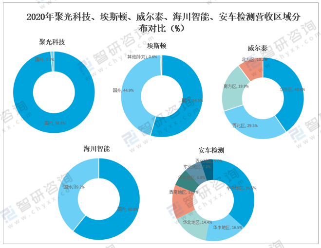 2020年聚光科技、埃斯頓、威爾泰、海川智能、安車檢測營收區域分布對比(%)