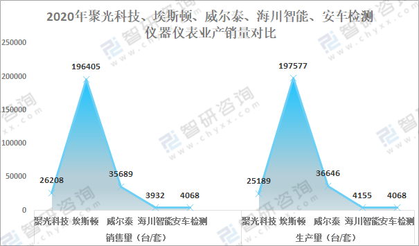 2020年聚光科技、埃斯頓、威爾泰、海川智能、安車檢測儀器儀表業產銷量對比