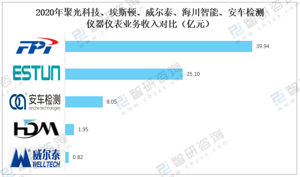 2020年聚光科技、埃斯頓、威爾泰、海川智能、安車檢測儀器儀表業務收入對比(億元)