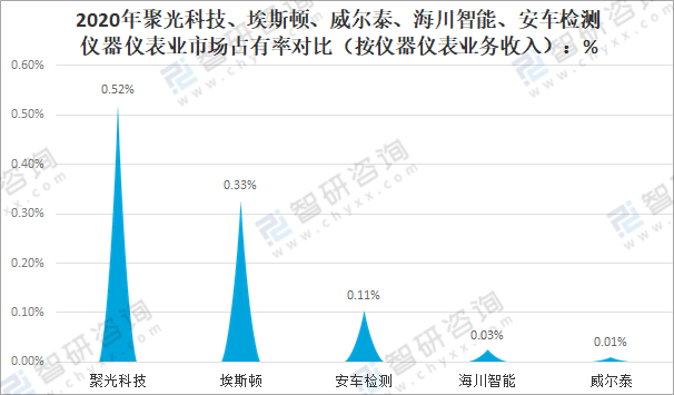 從市場占有率來看,2020年聚光科技儀器儀表業市場占有率略高于埃斯頓、威爾泰、海川智能、安車檢測,2020年聚光科技儀器儀表業務收入占全國儀器儀表業營業總收入的0.52%;埃斯頓儀器儀表業務收入占全國儀器儀表業營業總收入的0.33%;安車檢測儀器儀表業務收入占全國儀器儀表業營業總收入的0.11%;海川智能儀器儀表業務收入占全國儀器儀表業營業總收入的0.03%;威爾泰儀器儀表業務收入占全國儀器儀表業營業總收入的0.01%。