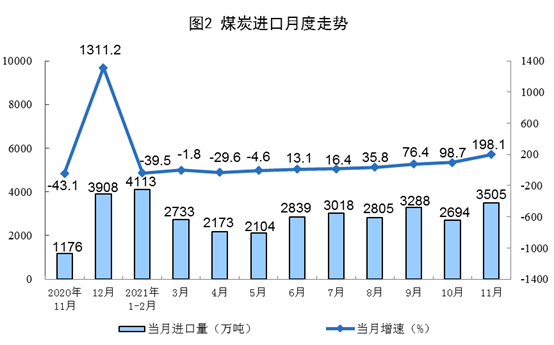 原煤生產(chǎn)有所加快。隨著增產(chǎn)保供政策持續(xù)推進(jìn),11月份,生產(chǎn)原煤3.7億噸,同比增長4.6%,增速比上月加快0.6個百分點(diǎn),比2019年同期增長6.1%,兩年平均增長3.0%,日均產(chǎn)量1236萬噸。進(jìn)口煤炭3505萬噸,同比增長198.1%。