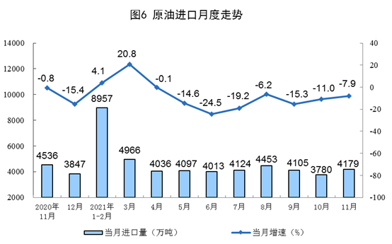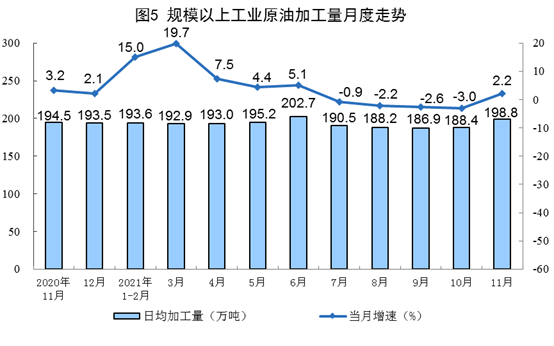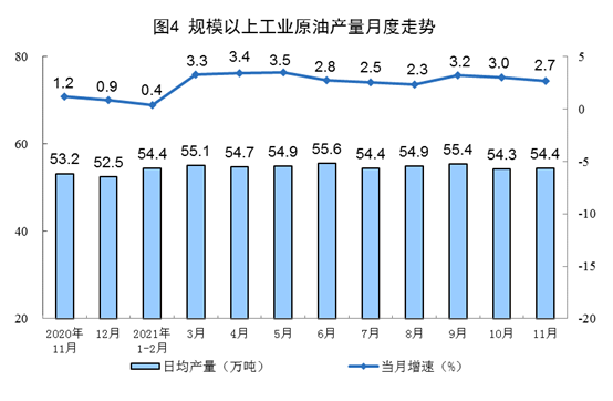 原油生產(chǎn)基本平穩(wěn),加工量由降轉(zhuǎn)增。11月份,生產(chǎn)原油1631萬噸,同比增長2.7%,增速比上月放緩0.3個百分點(diǎn),比2019年同期增長3.9%,兩年平均增長1.9%,日均產(chǎn)量54.4萬噸;加工原油5964萬噸,同比增長2.2%,增速由負(fù)轉(zhuǎn)正,上月為下降3.0%,比2019年同期增長5.5%,兩年平均增長2.7%,日均加工198.8萬噸。