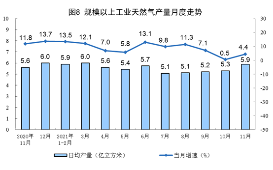 天然氣生產(chǎn)加快。11月份,生產(chǎn)天然氣177億立方米,同比增長4.4%,增速比上月加快3.9個百分點(diǎn),比2019年同期增長16.7%,兩年平均增長8.0%,日均產(chǎn)量5.9億立方米。