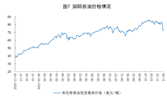 原油進(jìn)口降幅收窄,國際原油價格下跌。11月份,進(jìn)口原油4179萬噸,同比下降7.9%,降幅比上月收窄3.1個百分點(diǎn);1—11月份,進(jìn)口原油46684萬噸,同比下降7.3%。11月29日,布倫特原油現(xiàn)貨離岸價格為73.3美元/桶,比10月29日下跌11.7%。
