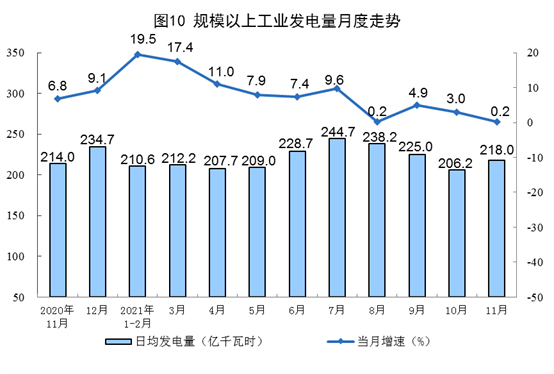 電力生產(chǎn)增速繼續(xù)回落。11月份,發(fā)電6540億千瓦時,同比增長0.2%,增速比上月回落2.8個百分點(diǎn),比2019年同期增長7.0%,兩年平均增長3.5%,日均發(fā)電218億千瓦時。1—11月份,發(fā)電73827億千瓦時,同比增長9.2%,比2019年同期增長11.3%,兩年平均增長5.5%。