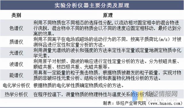 實(shí)驗(yàn)分析儀器是用于測(cè)定物質(zhì)的組成、結(jié)構(gòu)等特性的儀器。實(shí)驗(yàn)分析儀器主要包括色譜儀、質(zhì)譜儀、光譜儀、波譜儀、能譜儀、電化學(xué)分析儀、熱學(xué)分析儀等。其中光譜儀、質(zhì)譜儀、色譜儀和實(shí)驗(yàn)室設(shè)備是其最重要的產(chǎn)品分支。