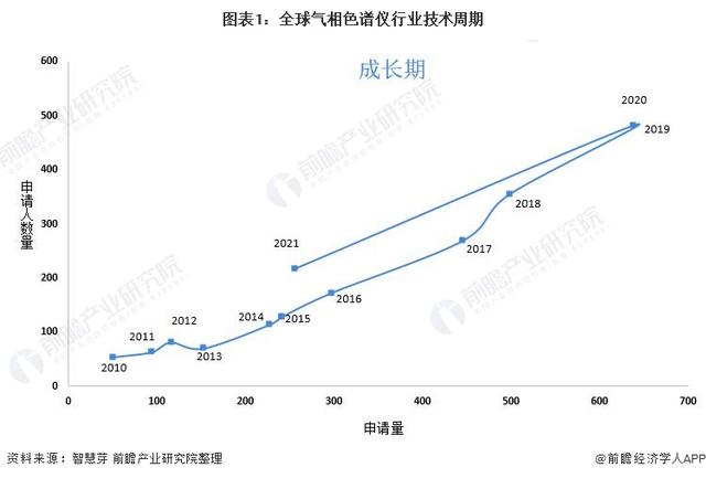 2010-2020年,全球氣相色譜儀行業專利申請人數量及專利申請量整體上呈現增長態勢,雖然2021年行業專利申請量和申請人數量有所下降,但整體來看,全球氣相色譜儀技術處于成長期。
