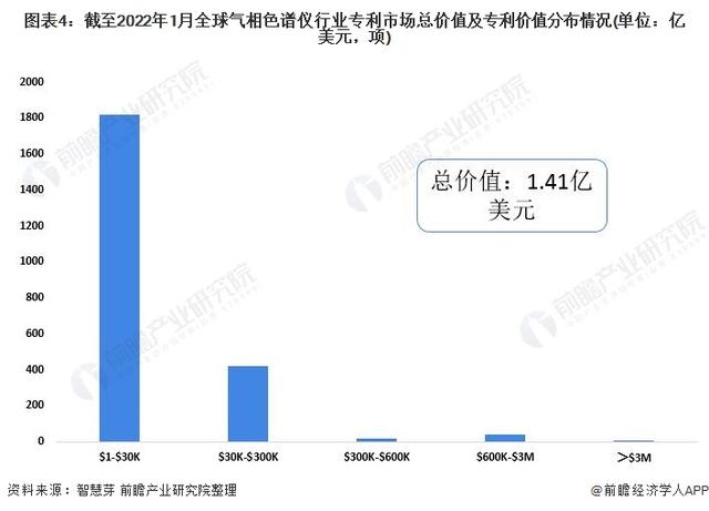 目前,全球氣相色譜儀行業專利總價值為1.41億美元。其中,3萬美元以下的氣相色譜儀專利申請數量最多,為1818項;其次是3萬-30萬美元的氣相色譜儀專利,合計專利申請量為422項。3百萬美元以上的氣相色譜儀專利申請數量最少,為8項。