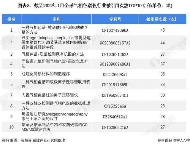 一種氣相色譜-質譜聯用檢測脂肪酸含量的方法(專利號:CN102749396A)和改變pgc-1alapha、ampk、fiaf或胃腸道微生物群作為調節受試者體內脂肪和/或體重減輕的手段(專利號:WO2008083157A2)是被引用次數最多的兩大氣相色譜儀專利,兩者被引用的次數均超過了40次。其他被引用次數前十大專利如下所示: