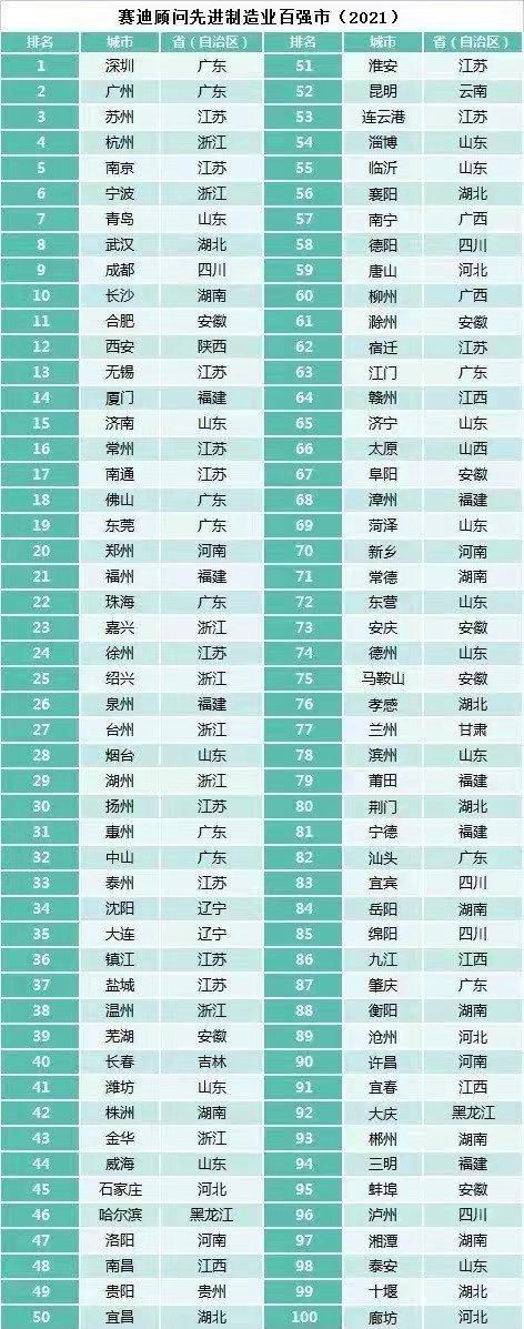 前段時間,賽迪顧問對全國293個地級市的先進制造業發展情況進行了系統研究和綜合評估,發布了《賽迪顧問先進制造業百強市(2021)》,根據榜單可以看到,目前我國先進制造業前十強依次是深圳、廣州、蘇州、杭州、南京、寧波、青島、武漢、成都和長沙。