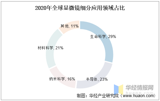 據(jù)統(tǒng)計(jì),2020年全球顯微鏡細(xì)分應(yīng)用領(lǐng)域情況為:生命科學(xué)占比29%、半導(dǎo)體材料占比23%、材料科學(xué)占比21%、納米科學(xué)占比16%、其他領(lǐng)域占比11%。