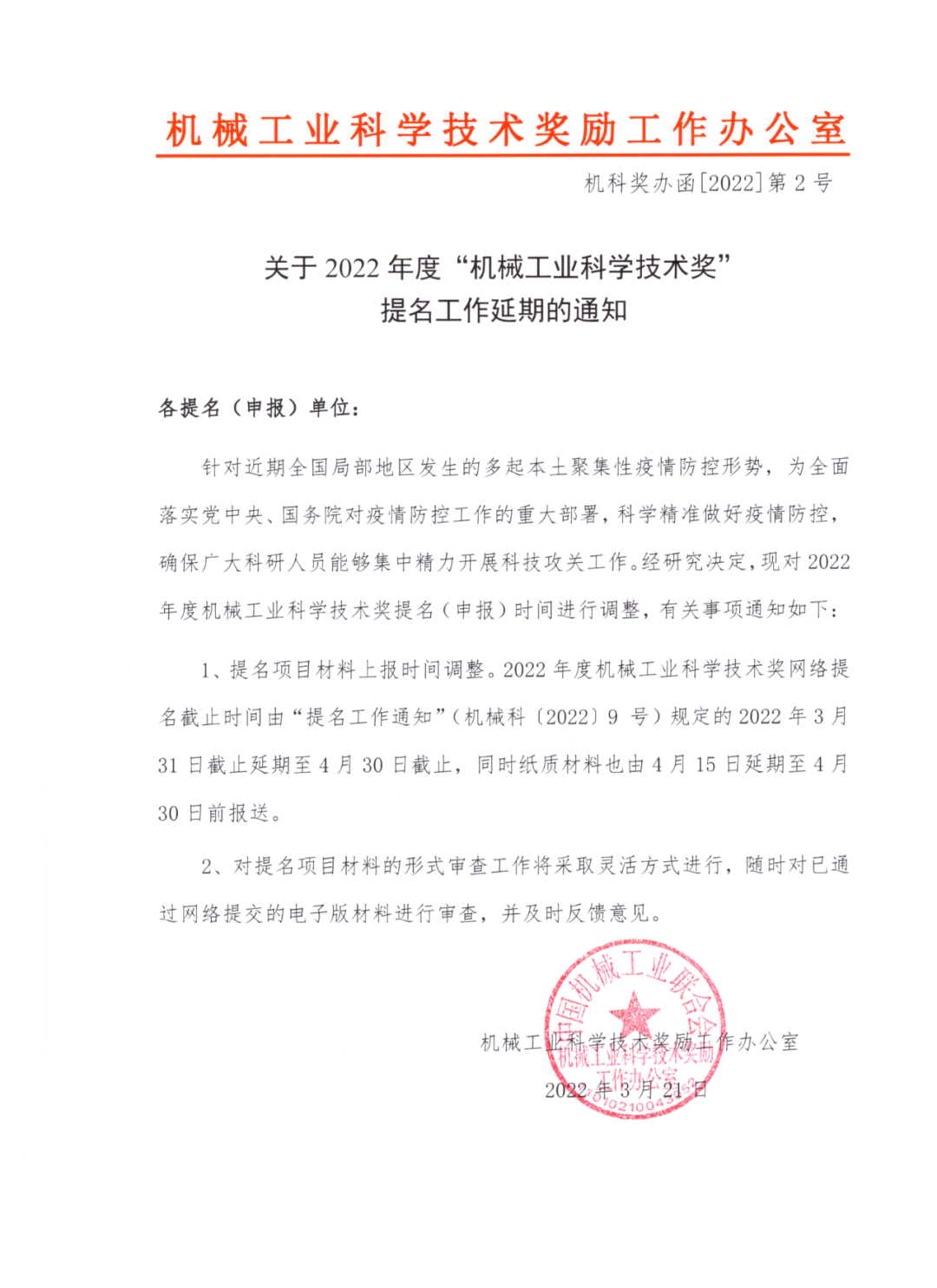 針對近期全國局部地區發生的多起本土聚集性疫情防控形勢, 為全面落實黨中央、國務院對疫情防控工作的重大部署,科學精準做好疫情防控,確保廣大科研人員能夠集中精力開展科技攻關工作。經研究決定,現對2022年度機械工業科學技術獎提名(申報)時間進行調整,有關事項通知如下∶
