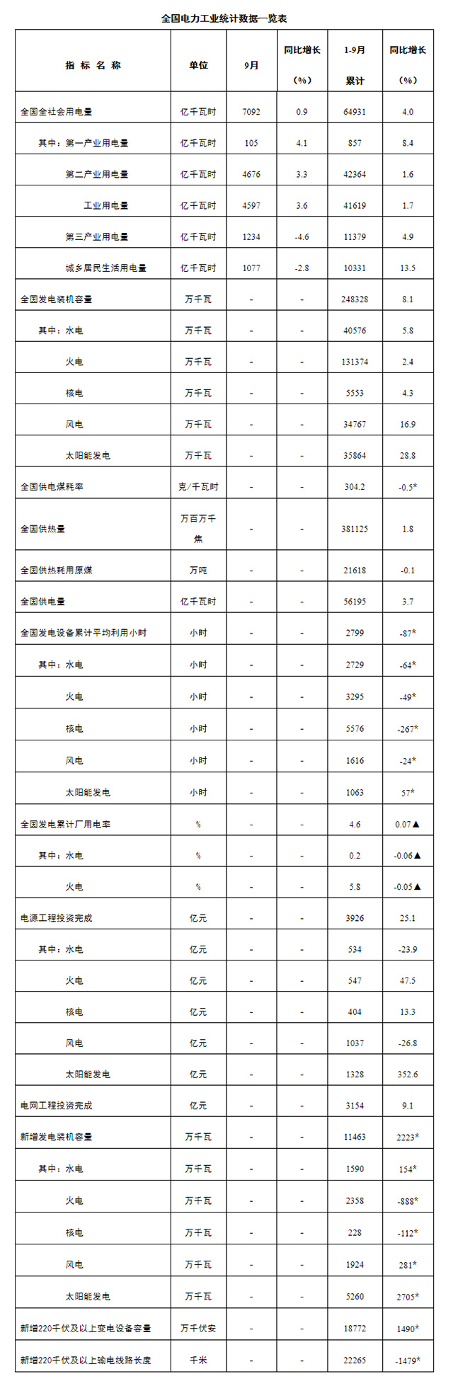 1—9月份,全國發電設備累計平均利用2799小時,比上年同期減少87小時。其中,火電3295小時,比上年同期減少49小時;核電5576小時,比上年同期減少267小時;風電1616小時,比上年同期減少24小時。