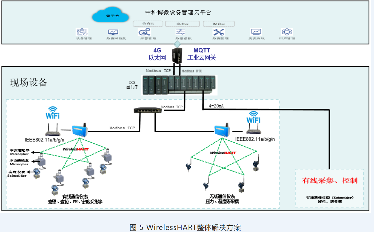 中科博微目前已經(jīng)將WirelessHART國(guó)產(chǎn)化產(chǎn)品研發(fā)逐步轉(zhuǎn)移打造適應(yīng)不同工況的WirelessHART產(chǎn)品整體解決方案階段,基于WirelessHART國(guó)產(chǎn)化產(chǎn)品,打通“上游”“下游”國(guó)產(chǎn)化保障渠道,開(kāi)發(fā)設(shè)備管理軟件平臺(tái),如:NCS-View、NCS-AMS等,實(shí)現(xiàn)多協(xié)議無(wú)線網(wǎng)絡(luò)深度融合及數(shù)據(jù)互聯(lián),基于交叉融合特征的集成化創(chuàng)新、滲透輻射特征的跨領(lǐng)域創(chuàng)新,應(yīng)對(duì)疫情環(huán)境下帶來(lái)的行業(yè)商業(yè)模式創(chuàng)新,實(shí)現(xiàn)以工業(yè)物聯(lián)網(wǎng)架構(gòu)下的行業(yè)整體解決方案,逐步完成布局,建立并形成工業(yè)物聯(lián)網(wǎng)完善的生態(tài)圈建設(shè)。如圖5所示。