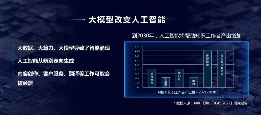 那么這樣會導(dǎo)致什么呢?導(dǎo)致人們的工作效率大幅度地提升。比如說,在內(nèi)容創(chuàng)作、客戶服務(wù)、翻譯這些工作,它的效率會大幅度地提升。所以我們也看到,很多研究機(jī)構(gòu)都認(rèn)為,在未來的10年,很多工作它的效率會成倍成倍的提升。同時也帶來一些擔(dān)心,是不是這樣的效率提升,會使得很多人的工作就沒了?這些人工作丟掉之后,會不會給我們?nèi)祟悗聿豢深A(yù)知的問題。