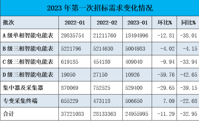 從需求量的同比和環比數據來看,除專變采集終端(含能源控制器專變)分標環比需求量有增長外,其他物資需求量都下降。