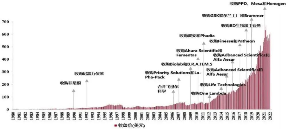 對于并購標的的選擇尤其偏愛細分龍頭。比如2011年以21億美元收購美國戴安公司,成為色譜行業(yè)領先者;2021年,174億美元收購PPD,躋身全球CRO行業(yè)TOP 5。