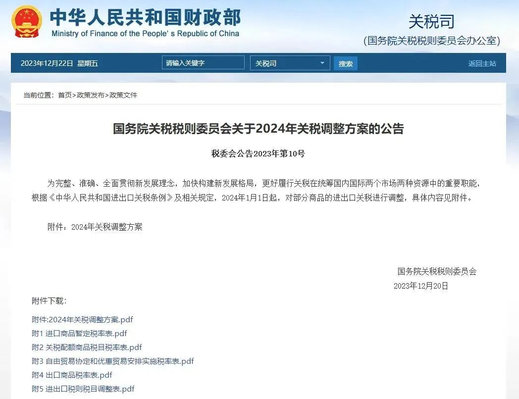 12月21日,國務院關稅稅則委員會發布2024年關稅調整方案公告。為完整、準確、全面貫徹新發展理念,加快構建新發展格局,更好履行關稅在統籌國內國際兩個市場兩種資源中的重要職能,根據《中華人民共和國進出口關稅條例》及相關規定,2024年1月1日起,對部分商品的進出口關稅進行調整。