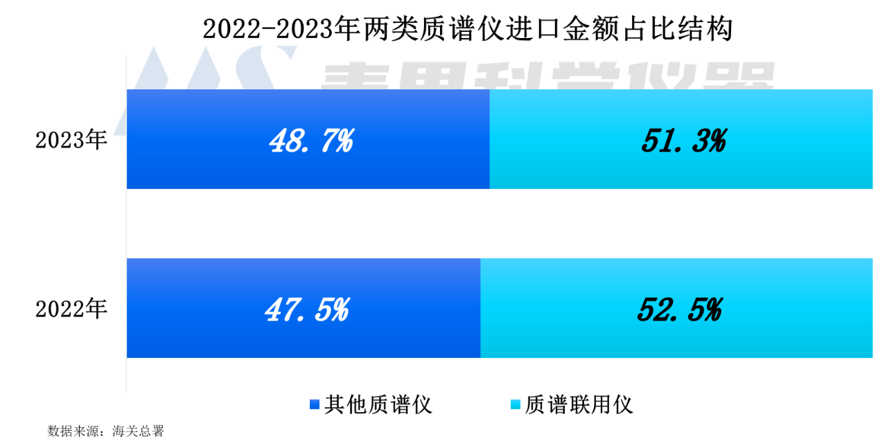 2023年質(zhì)譜聯(lián)用儀的進(jìn)口金額占比達(dá)51.3%,與上年相比減少1.2個(gè)百分點(diǎn);其他質(zhì)譜儀的占比為48.7%。從兩類質(zhì)譜儀的金額占比結(jié)構(gòu)看,質(zhì)譜聯(lián)用儀的進(jìn)口需求更旺盛,但兩類質(zhì)譜儀的份額差距在縮小。