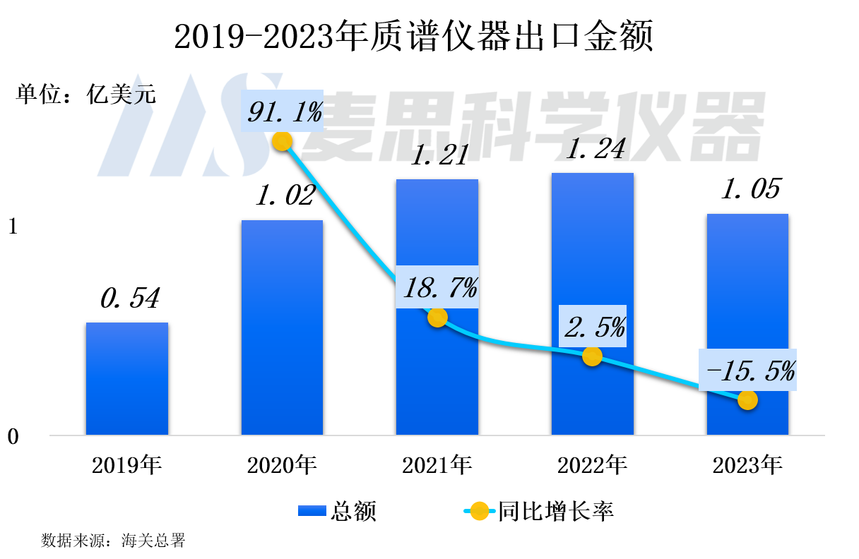 2023年我國質(zhì)譜儀器出口金額達(dá)1.05億美元(約合人民幣7.35億元),同比下降15.5%。