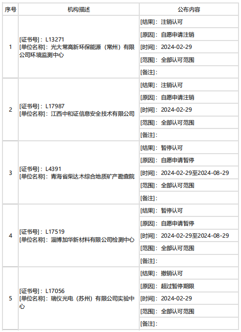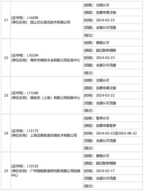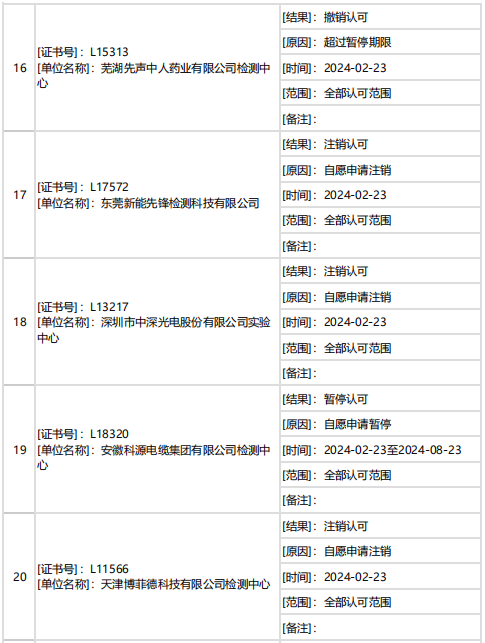 據(jù)中國合格評定國家認(rèn)可委員會(CNAS)消息,2月下半月共計27家機(jī)構(gòu)暫停/撤銷/注銷認(rèn)可資質(zhì)。7家機(jī)構(gòu)因超過暫停期限被撤銷認(rèn)可,其他機(jī)構(gòu)為自愿申請暫停/注銷認(rèn)可。