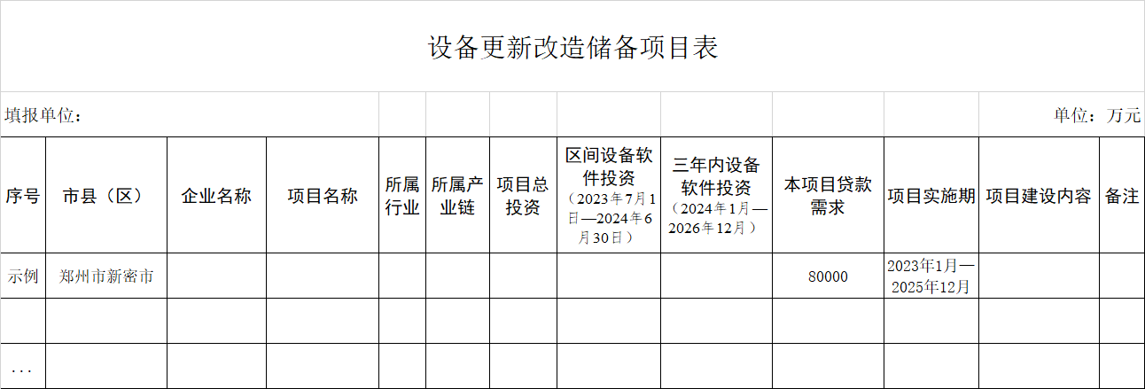 經研究,河南省現開展制造業領域設備更新改造項目摸排,要求各地組織企業填報《設備更新改造儲備項目表》。