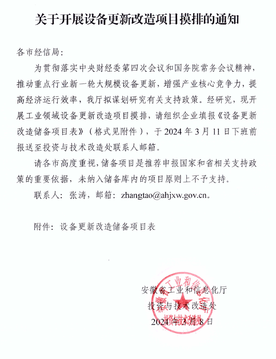 38日,安徽省工信廳投資與技術改造處發布《關于開展設備更新改造項目摸排的通知》。為貫徹落實中央財經委第四次會議和國務院常務會議精神,推動重點行業新一輪大規模設備更新,增強產業核心競爭力,提高經濟運行效率,安徽省工信廳擬謀劃研究有關支持政策。