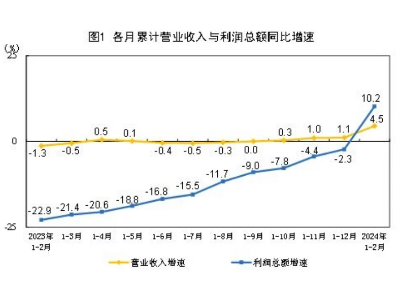 12月份,規模以上工業企業實現營業收入19.44萬億元,同比增長4.5%;發生營業成本16.52萬億元,增長4.6%;營業收入利潤率為4.70%,同比提高0.24個百分點。