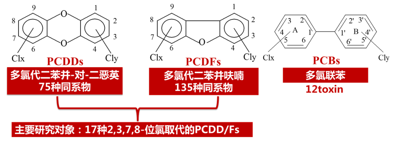 二噁英及其類似物是一類含有苯環結構的特定有機化合物的總稱,包括多氯代二苯并二噁英(PCDDs)和多氯代二苯并呋喃(PCDFs)和類二噁英多氯聯苯(DL-PCBs)等,具有持久性、生物富集、長距離遷移和生物毒性等特點。其中以172,3,7,8位氯取代的PCDD/Fs12DL-PCBs同族體被認為對人類和生物危害最嚴重。