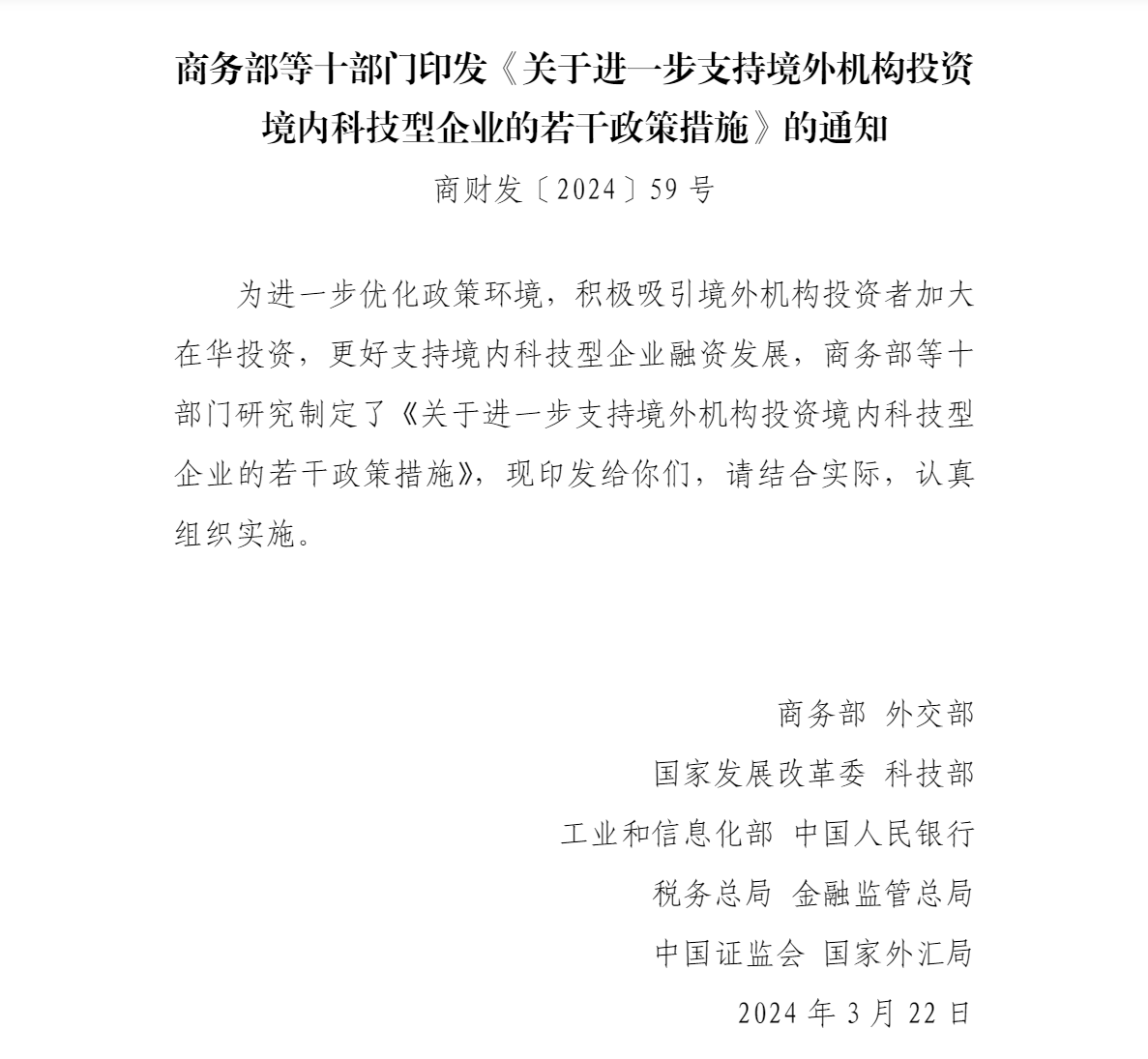 近日,商務(wù)部、外交部、國家發(fā)展改革委、科技部、工業(yè)和信息化部、中國人民銀行、稅務(wù)總局、金融監(jiān)管總局、中國證監(jiān)會(huì)、國家外匯局十部門聯(lián)合印發(fā)《關(guān)于進(jìn)一步支持境外機(jī)構(gòu)投資境內(nèi)科技型企業(yè)的若干政策措施》(以下簡稱《若干措施》)。